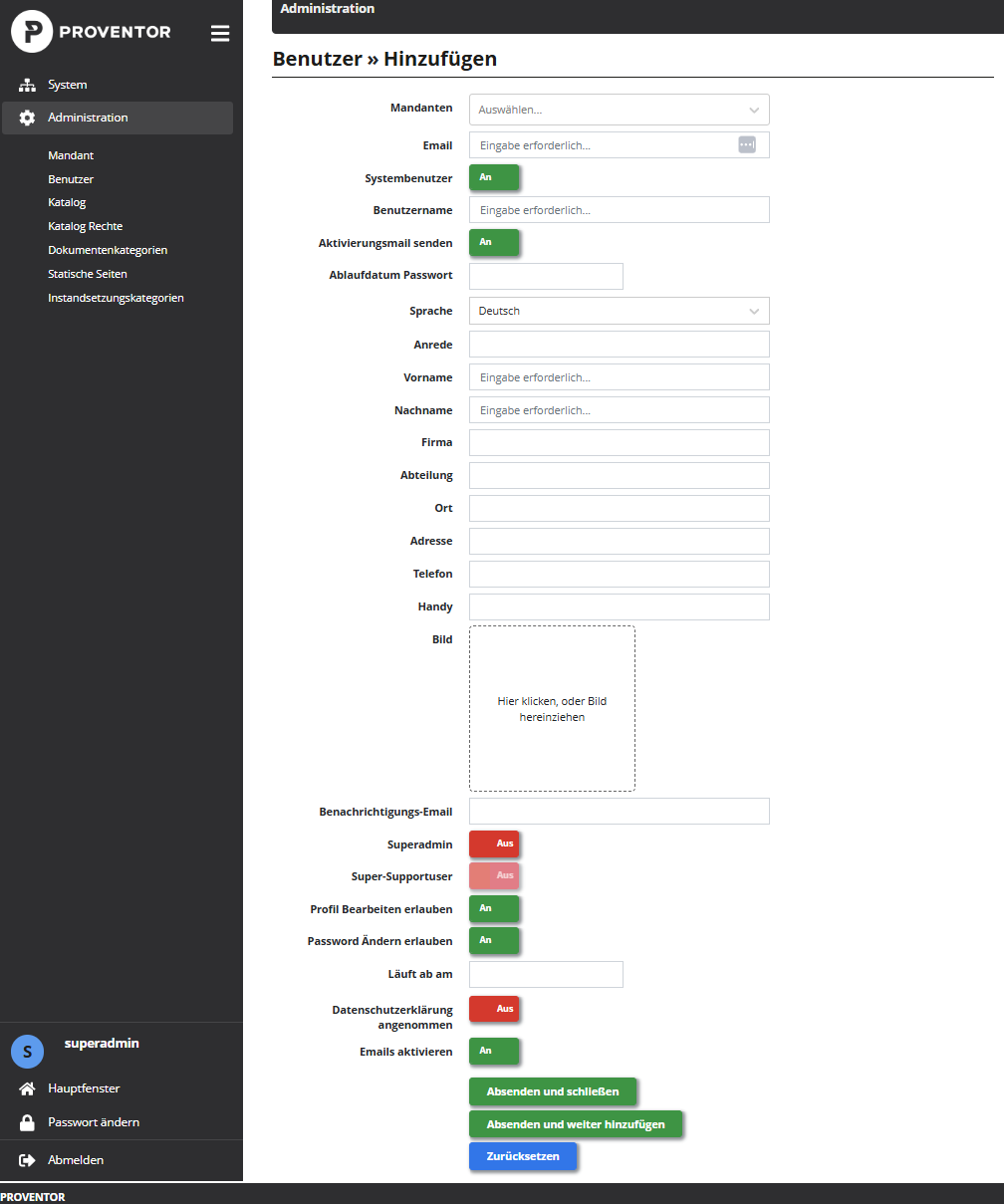 Superadmin: AN bedeutet, dass dieser Benutzer über Systemadministratorenrechte verfügt.